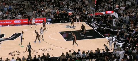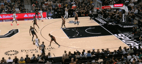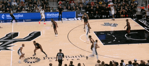 在第四节的前半段,马刺用得最多的还是文班掩护后罚球线附近持球进攻,只是如前边所说,阿德巴约的位置控制得很好,他跟随底线的对手,又能在马刺弧顶发起后迅速对位文班。